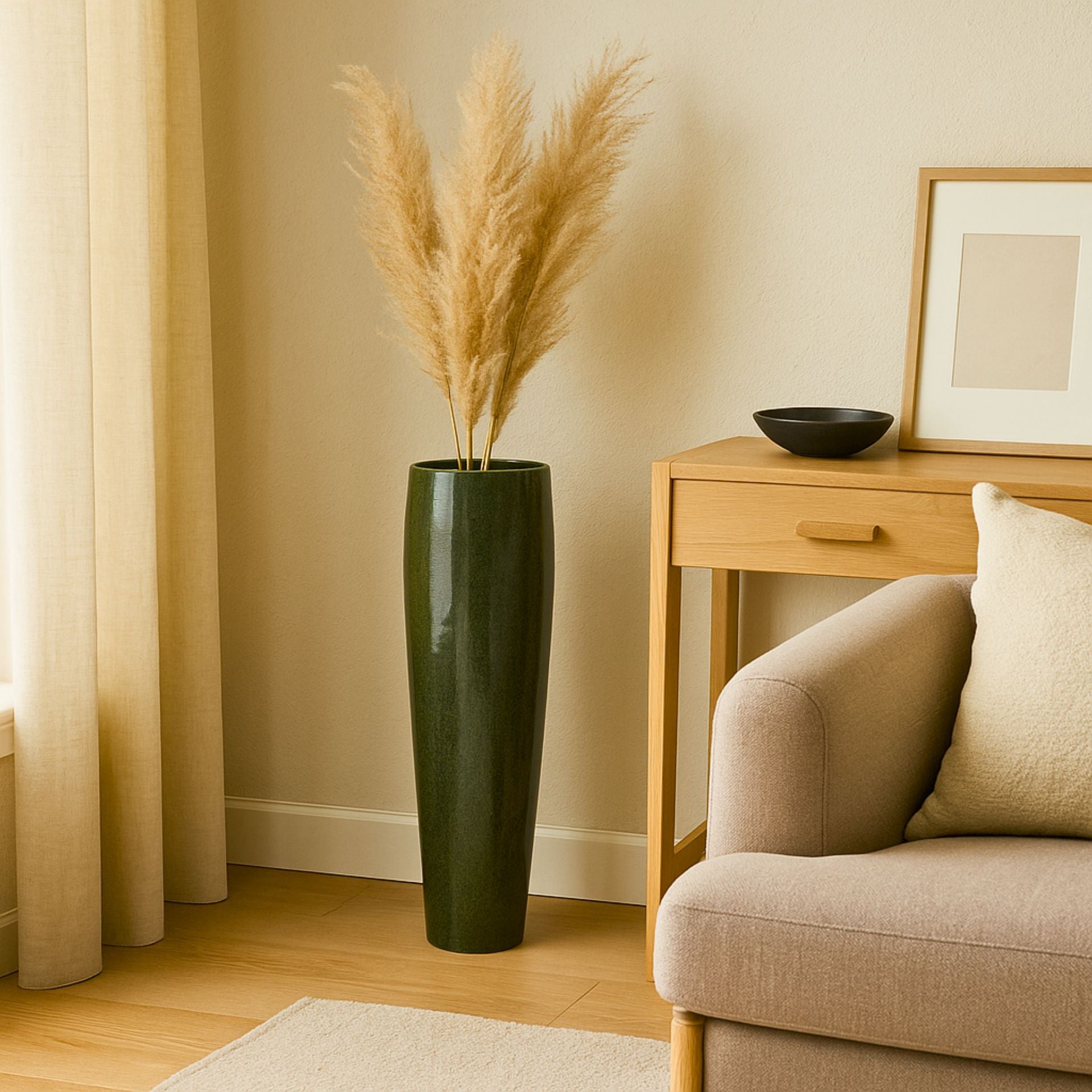 Méret: Ø27 × 75 cm • Anyag: kerámia • Szín: sötétzöld, fényes máz • Elhelyezés: padlón, sarokban, konzol vagy komód mellé