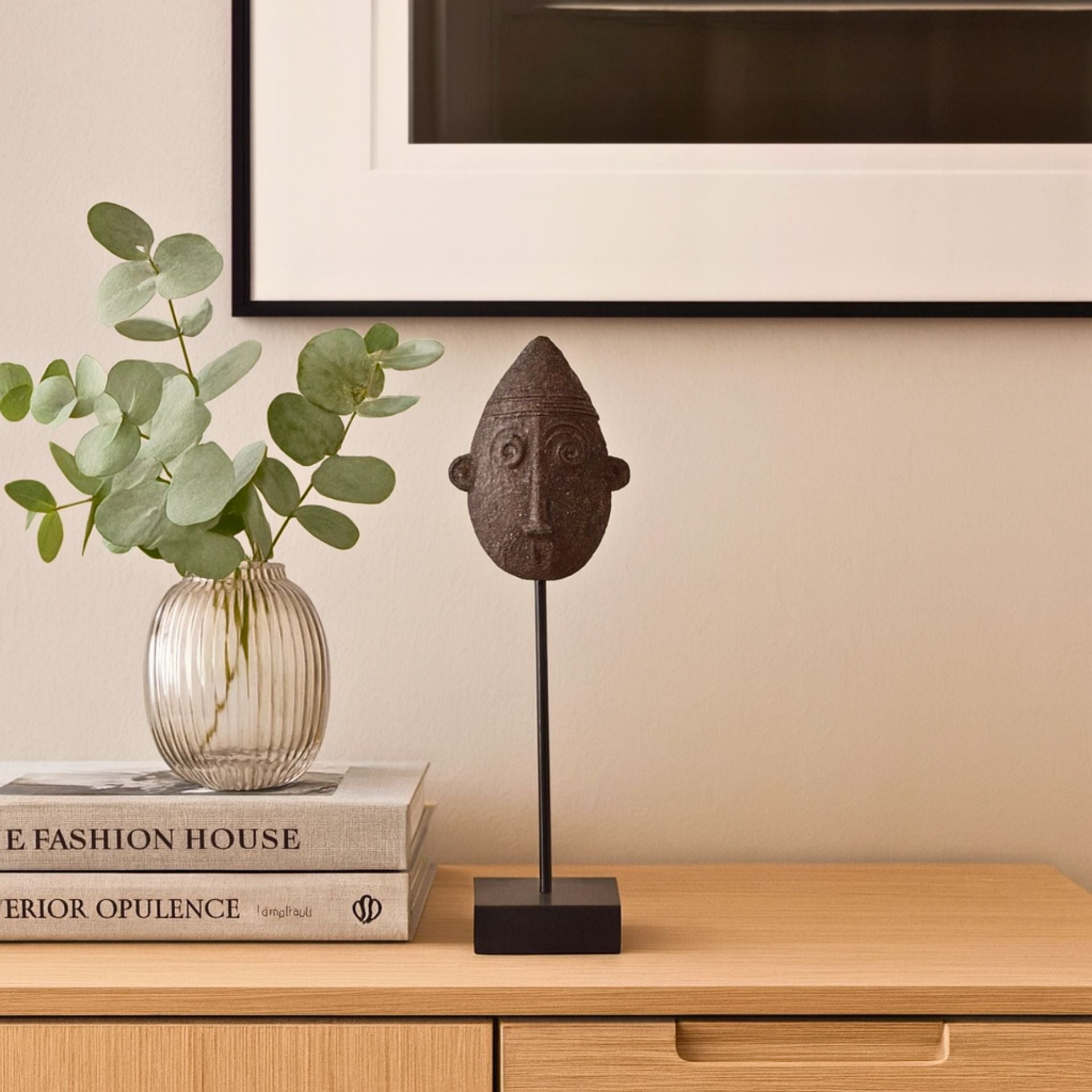 - Szoborszerű jelenlét – törzsi fej motívum kortárs értelmezésben, erős karakterrel.