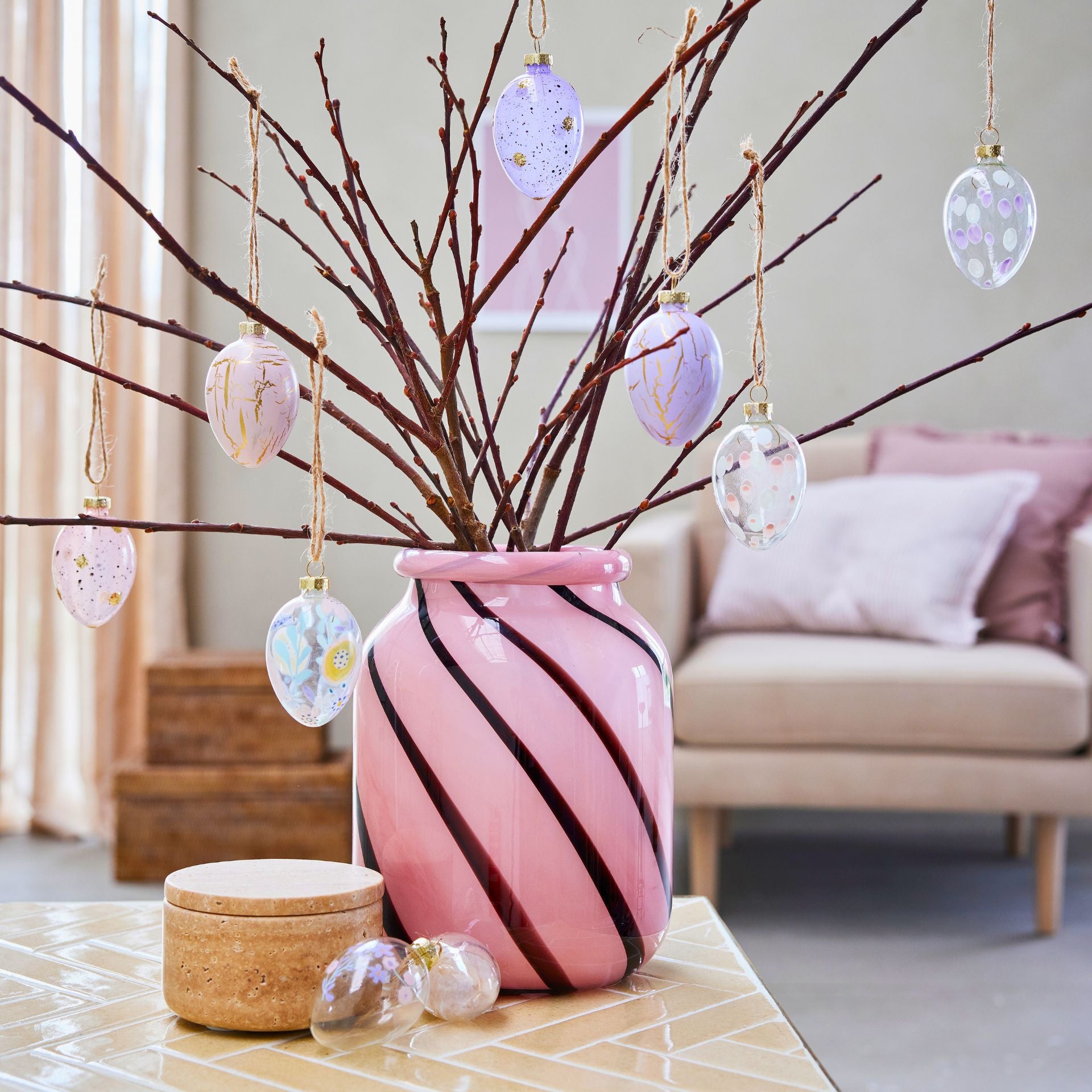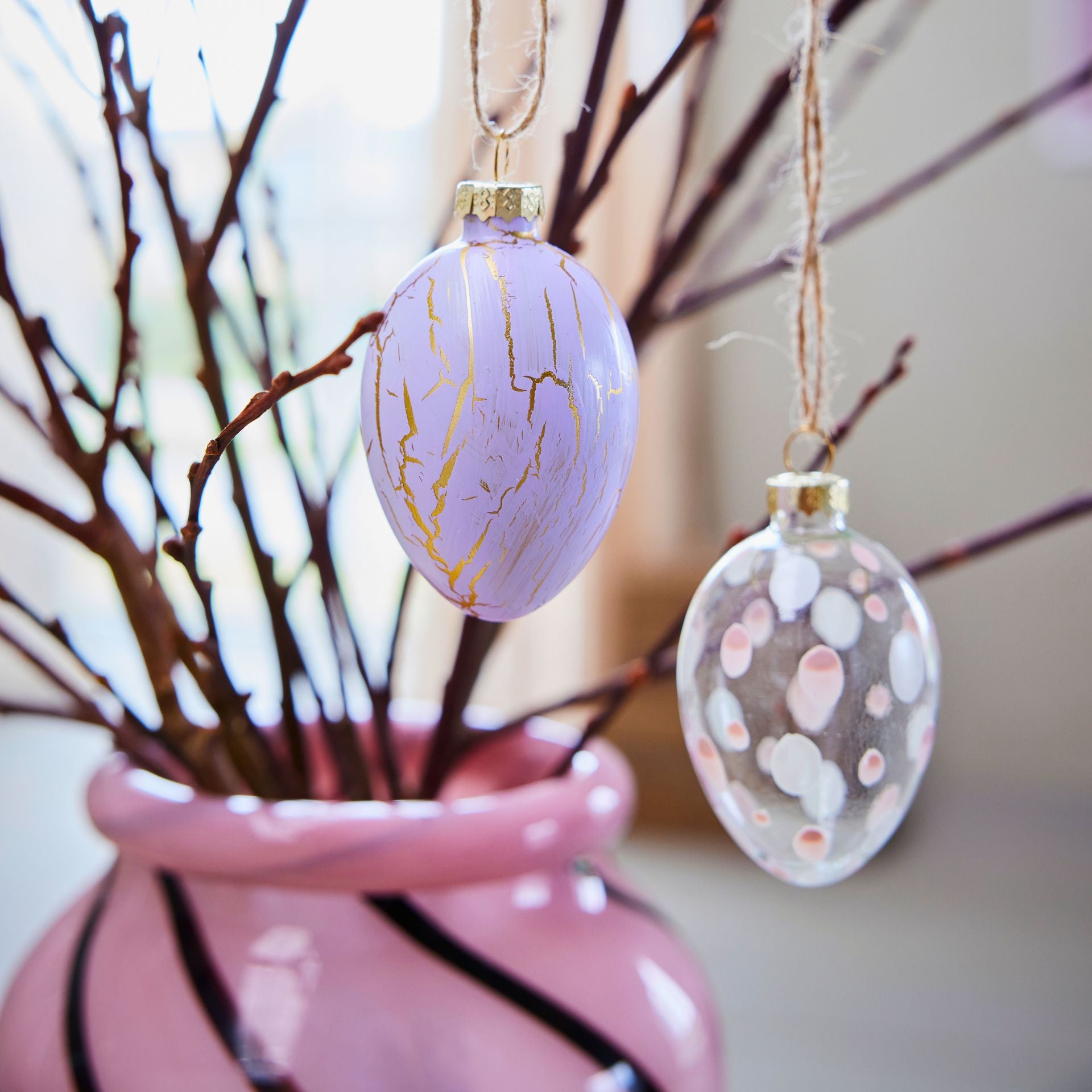 Vidám, friss tavaszi hangulat egy könnyed üveg díszben. A Fedora húsvéti tojás átlátszó üvegből készül, finom lila és fehér pöttyökkel díszítve. Arany színű kupakkal és natúr akasztóval érkezik, így azonnal felakaszthatod egy váza ágaira vagy ajtódíszre.
