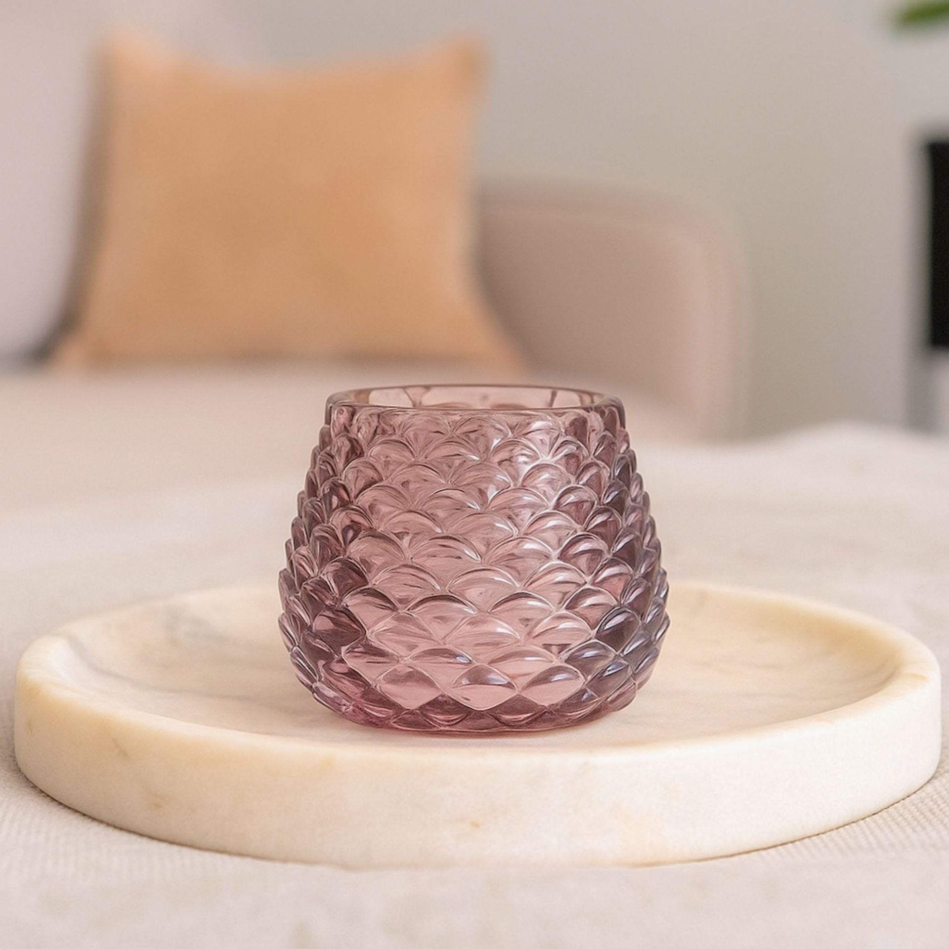 Finom, levendula árnyalatú üveg mécsestartó, látványos „pikkelyes” relief mintával, amely gyertyafényben különlegesen tördelve veri vissza a fényt. A kompakt méretnek köszönhetően könnyen elhelyezheted a dohányzóasztalon, komódon vagy tálcán, és remekül kombinálható más üvegkiegészítőkkel is. Letisztult, mégis karakteres darab, amely skandináv, modern és romantikus enteriőrben egyaránt harmonikusan mutat.