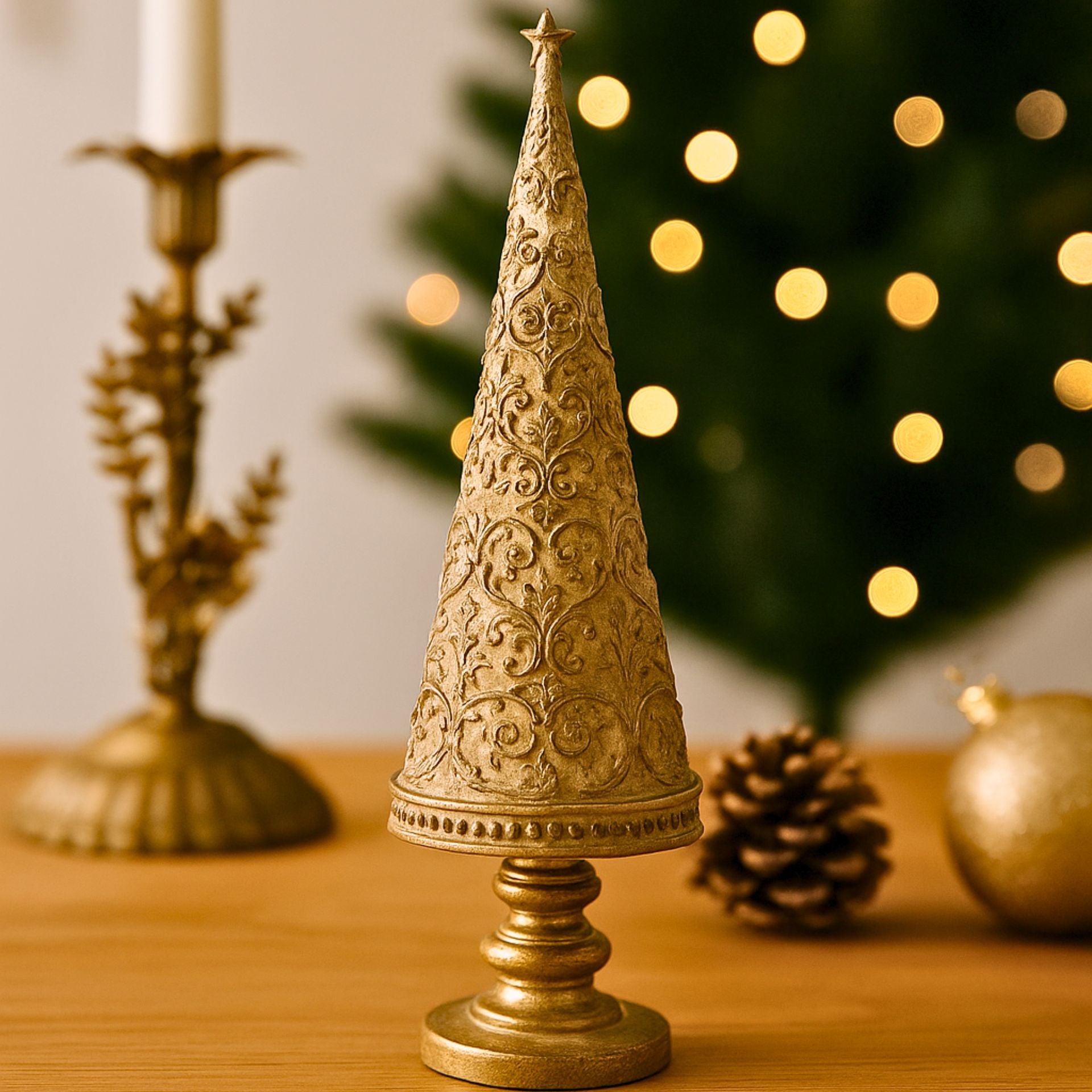 A szettben egy 21,5 cm és egy 31,5 cm magas, részletgazdag, barokk mintázatú karácsonyfa kapott helyet. A finoman csillogó antik arany felület és a klasszikus talpkialakítás elegáns, fényűző ünnepi hangulatot teremt.